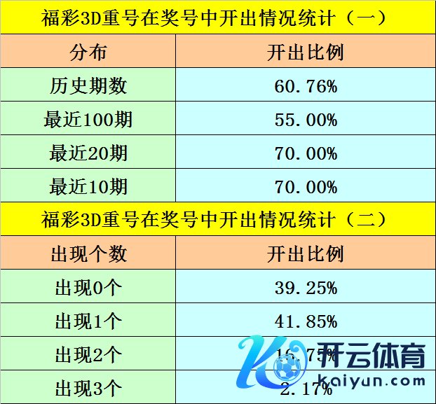 最近100期开奖中,含有重号的奖号有55期,最近20期含有重号的奖号有14期,最近10期含有重号的奖号有7期。本期排斥重号。