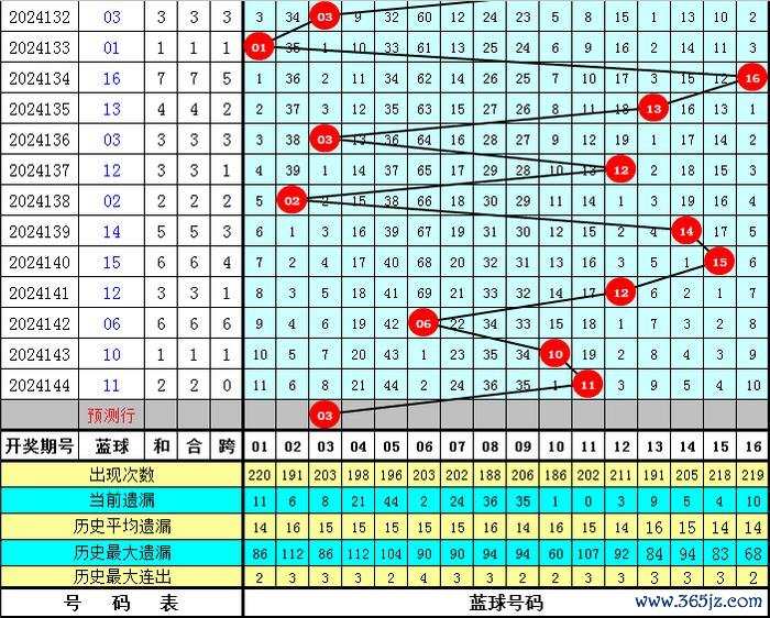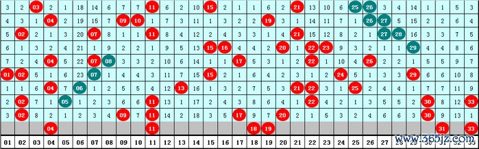 上期开出蓝球号码11,遗漏19期,为冷码。现在蓝球遗漏值15以上的冷码有5个:04、05、07、08、09;遗漏值在7-15之间的温码蓝球有4个:01、03、13、16;遗漏值6以内的热码蓝球有7个:02、06、10、11、12、14、15。本期得当眷注温码蓝球出现,参考蓝球号码:03、05、06、11、14。