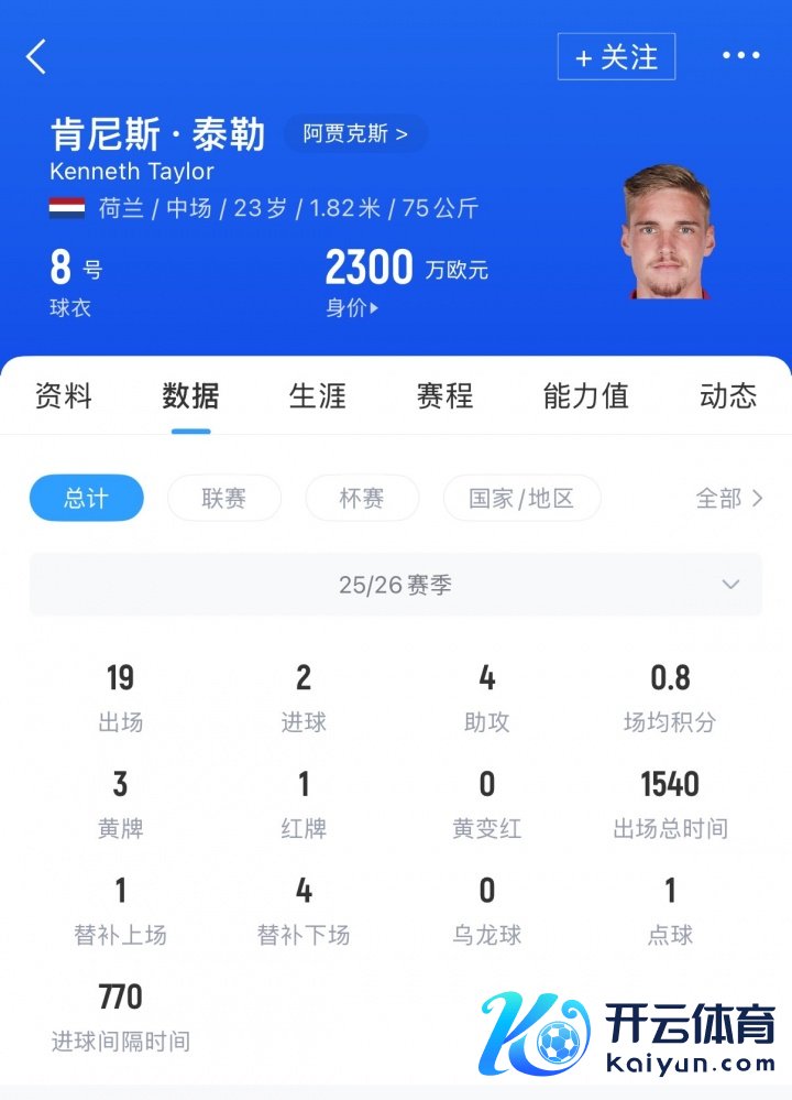 泰勒现年23岁,荷兰籍中场,本赛季代表阿贾克斯各赛事出场19次,孝顺2球4助,当今泰勒德回身价为2300万欧元。