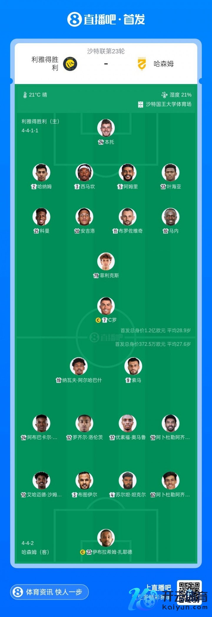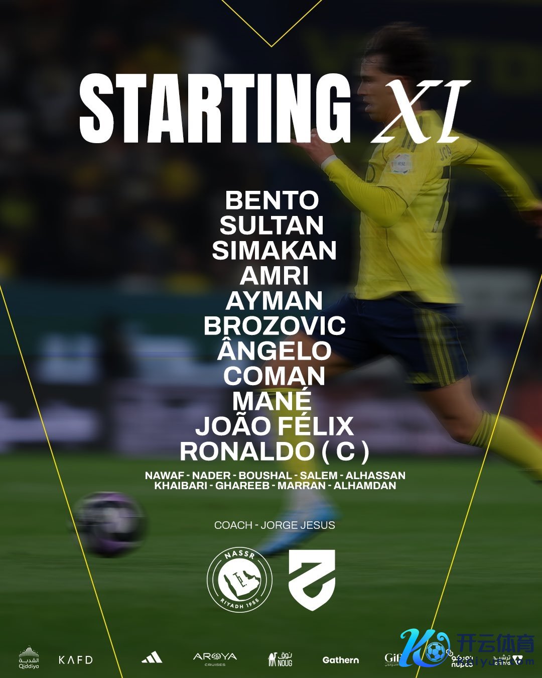 利雅得得胜首发:24-本托、2-哈纳姆、3-西马坎、5-阿姆里、23-叶海亚、11-布罗佐维奇、20-安吉洛、21-科曼、10-马内、79-菲利克斯、7-C罗
