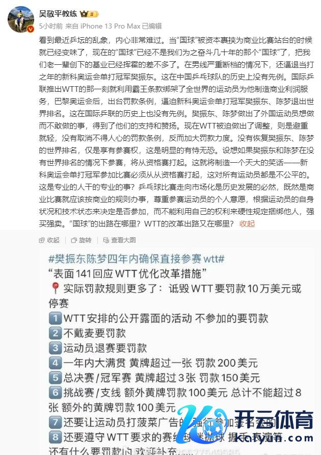 先从吴敬平敦厚启动。他但是出了名的直言快语,敢说敢月旦。此次他站出来,火力全开,一顿猛批WTT(寰宇业绩联赛)。他说,这个所谓的新赛事,说是为了膨胀乒乓,其实暗地里满脑子齐是生意利益,还勒索领悟员,把他们当钱树子。他例如子啊,比如樊振东、陈梦这些顶级选手,因为一些无语其妙的罚金战术,被逼退出排行争夺。这事搁谁身上齐窝火吧?吴相通看不外眼了,他以为这是对领悟员的不公,亦然对国球精神的一种伤害。