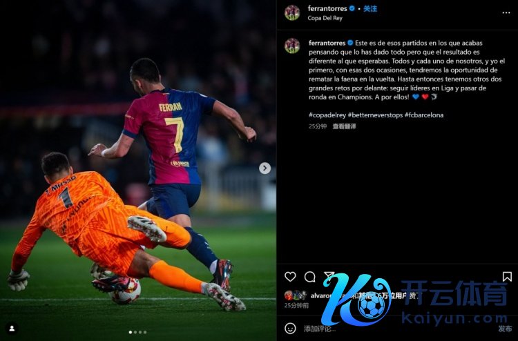 2月26日讯 国王杯半决赛首回合,巴萨4-4遭马竞绝平,费兰错失两次绝佳进球契机。赛后,费兰更新社媒,饱读励士气。