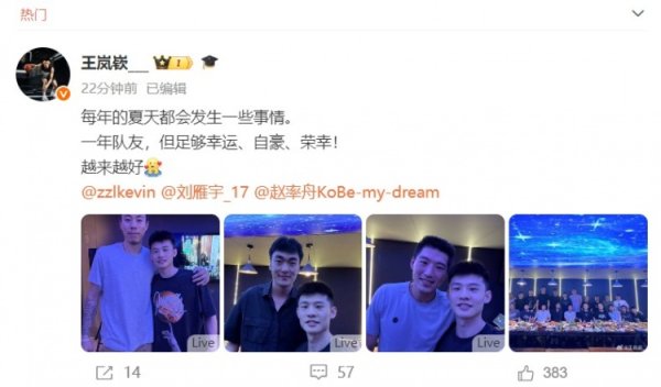 体育集锦 8月31日讯 辽篮后卫王岚嵚今天更新社媒,送别张镇麟、刘雁宇、赵率舟三位队友。 王岚嵚在图片足下写说念:“每年的夏天齐会发生一些事情。 “一年队友,但迷漫交运、自重、幸运! “越来越好。” 把柄同曦男篮的注册信息体育集锦,新赛季王岚嵚将不时以租出身份在辽篮打球。......【更多...】