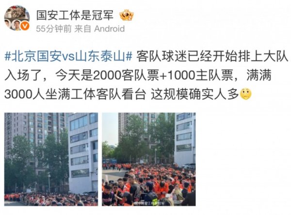 体育集锦 4月19日讯 中超第8轮将迎来焦点战“京鲁德比”,比赛将至今晚19:35在国安主场打响。 据博主“国安工体是冠军”报说念,将有3000名泰山球迷来到工体不雅战,况且客队球迷依然运行入场。该博主写说念: 客队球迷依然运行排上大队入场了,今天是2000客队票+1000主队票,满满3000东说念主坐满工体客队看台,这规模照实东说念主多。 图片起原:博主“国安工体是冠军”体育集锦......【更多...】