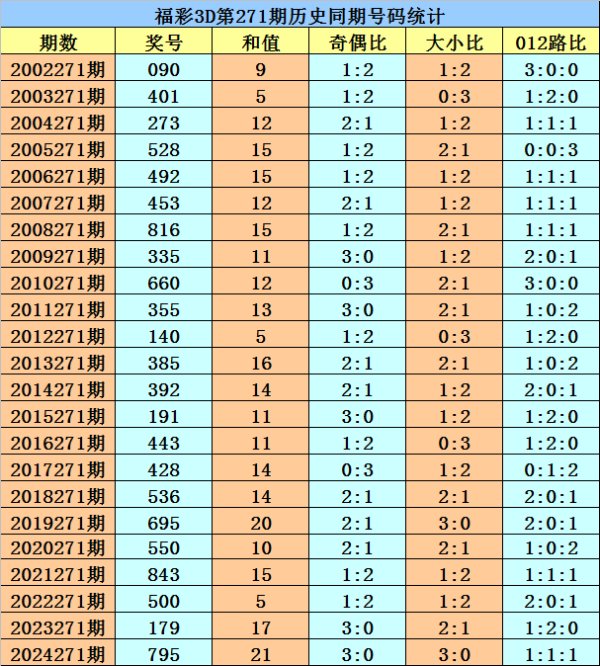 福彩3D第2025271期开奖日历:2025年10月12日,历史上第271期已开出了23次奖号,积年同时号码永诀为:090、401、273、528、492、453、816、335、660、355、140、385、392、191、443、428、536、695、550、843、500、179、795。 其中,组三出现8次,组六出现15次,单选0-9永诀开出: 奖号0开出8次; 奖号1开出6次; 奖号......【更多...】