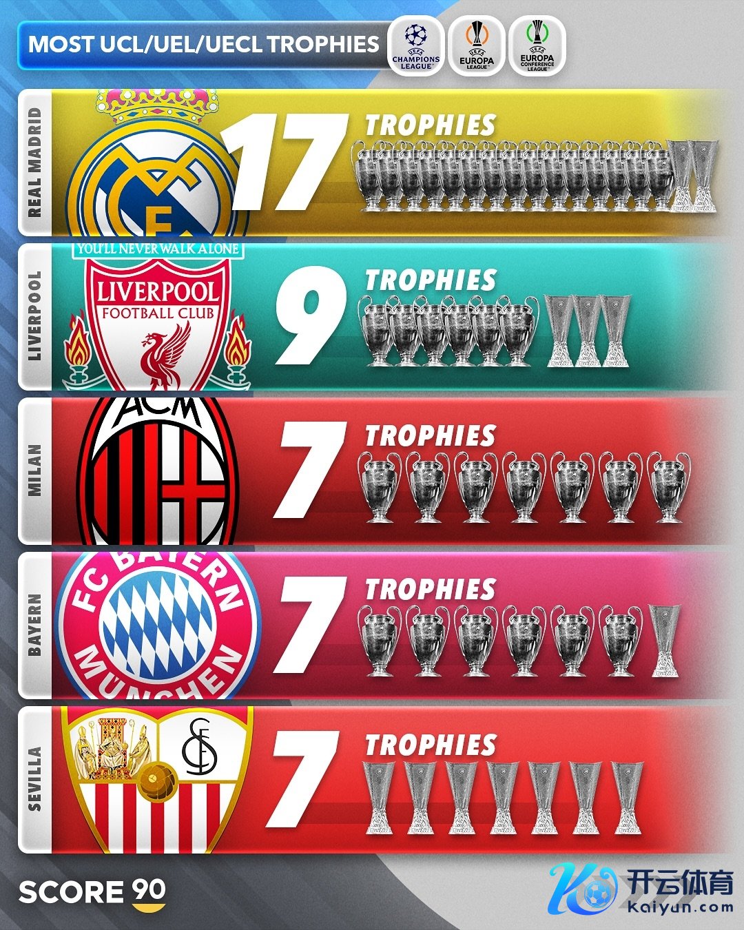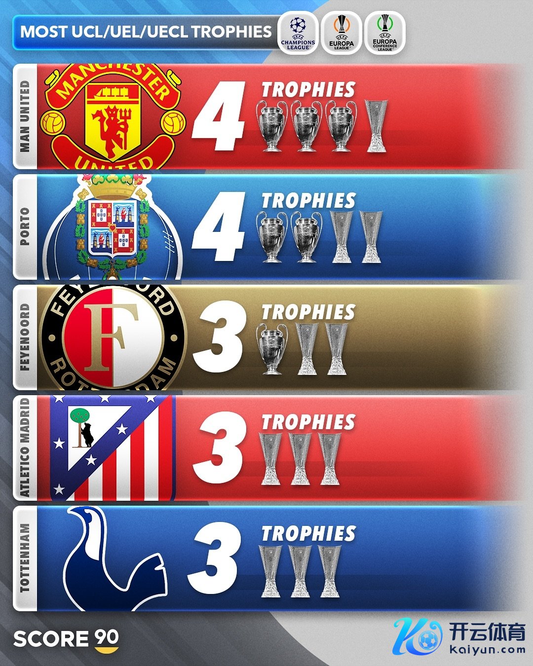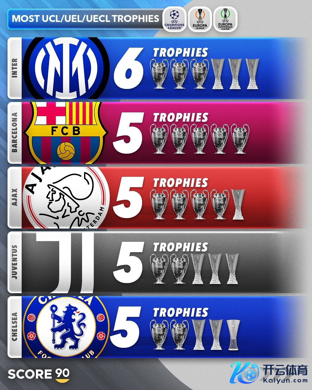 欧战(欧冠+欧联+欧协联)冠军数名次: