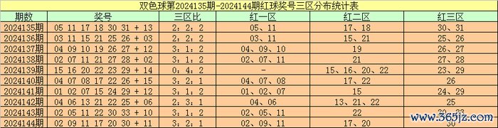 双色球第2024144期奖号为:02 09 11 17 20 30 + 11,红球三区比为3:2:1。