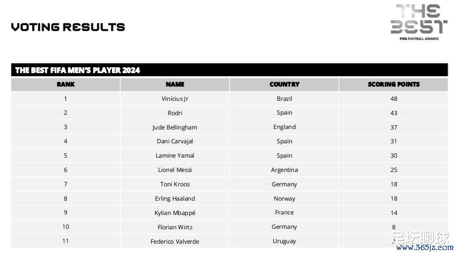 当受奖典礼为止之后,外洋足联公布了年度最好球员得分情况,其中维尼修斯唐突当选,主要依靠国度队队长、球迷投票2大上风,征服罗德里,后者则是国度队主帅、媒体代表的投票占优,但总分43分,也曾过期维尼修斯5分,排行第二。