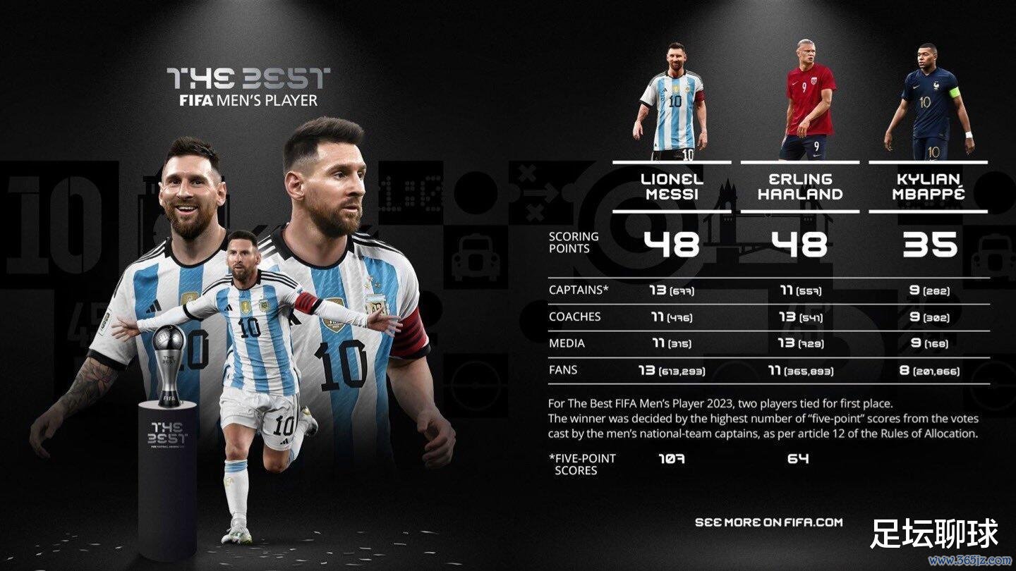 旧年,梅西其时打败的敌手是哈兰德,两东谈主总分48打平,其中梅西的国度队队长、球迷的投票占优,哈兰德则是国度队主帅、媒体记者2大部分的投票占优,最终,梅西凭借国度队队长得票数更多的微弱上风力压哈兰德。