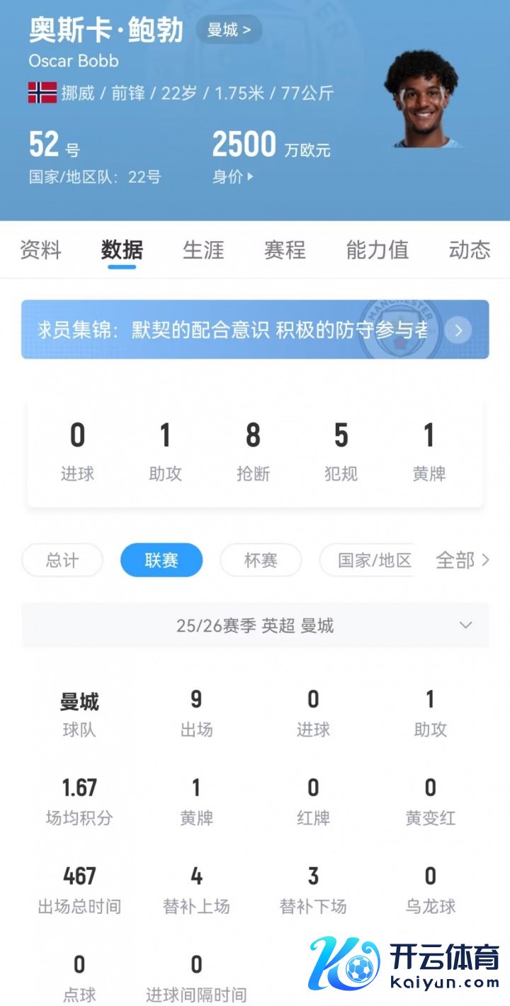 鲍勃现年22岁,司职右边锋,也能出任左边锋、伏击型中场位置,现在球员德转估值2500万欧,与曼城合同在2029年到期。新赛季于今,他代表曼城各赛事出战15场有1次助攻。