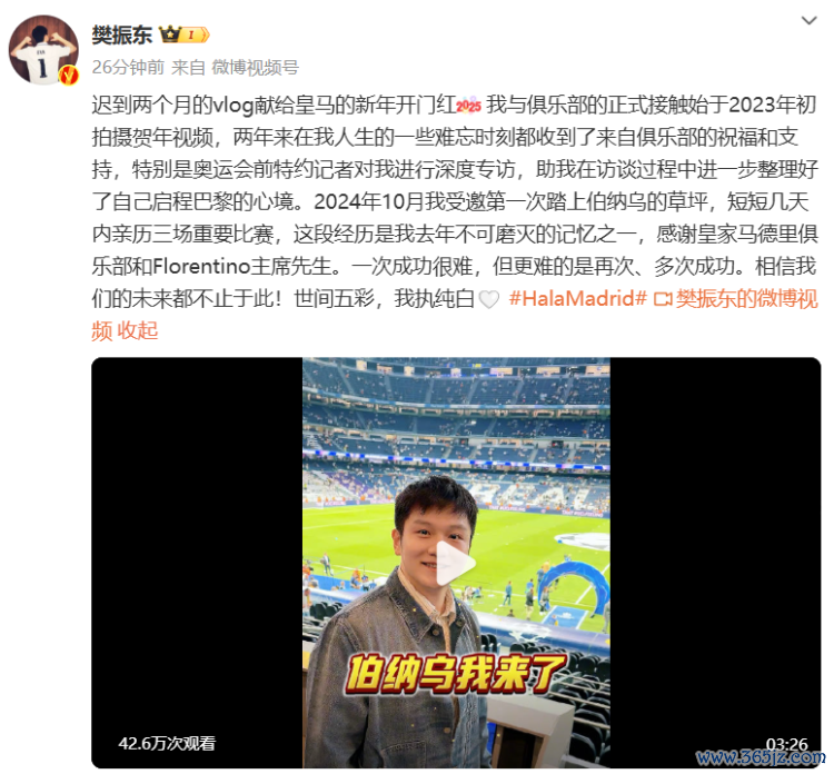 1月4日下昼,乒乓男单奥运冠军樊振东在个人叮嘱账号发布一条来到皇家马德里足球俱乐部的Vlog。樊振东暗示:“迟到两个月的Vlog献给皇马的新年开门红。”