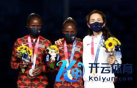 8月8日,肯尼亚选手切普奇奇(中)、亚军肯尼亚选手科斯盖(左)与好意思国选手塞德尔在结果式举行的受奖庆典上,她们分获东京奥运会女子马拉松的冠亚季军