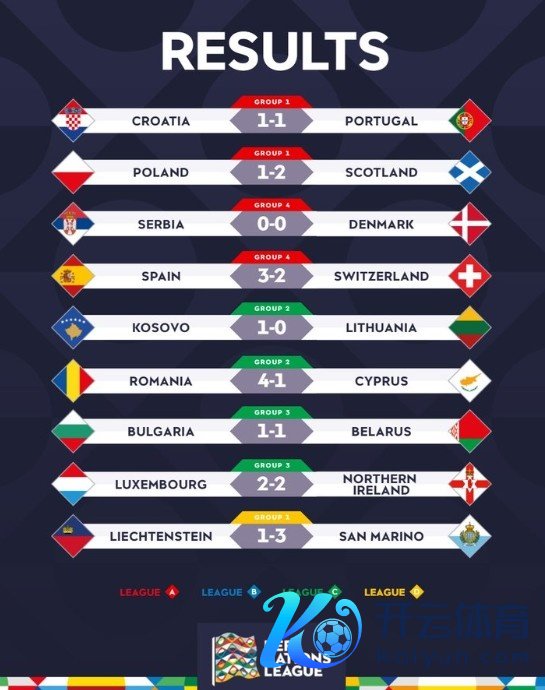 11月19日讯 欧国联A级联赛四个小组六轮一说念战罢,降入B联赛的四个限额也仍是细目。