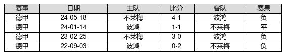 波鸿 VS 不莱梅两队近10年的交战次数为4场,波鸿0胜1平3负,赢球概率为0.0%,平局概率为25.0%,输球概率为75.0%。