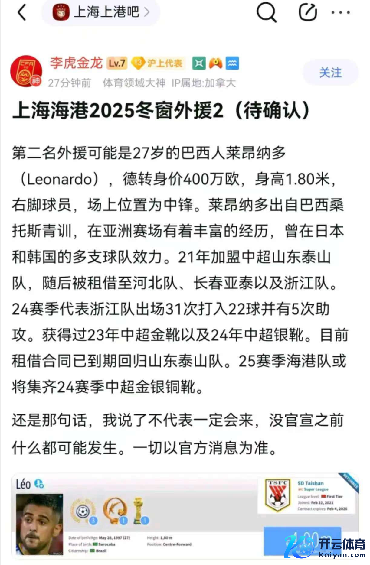 北京时辰1月4日体育录像/图片,一条关系山东泰山和上海海港进行球员交游的新闻,诱导了许多球迷的激情,阐述上海自媒体的爆料,合身价400万欧的泰山外助,能够率会成为上海海港新赛季的第2位外助,关于泰山队把莱昂纳多卖给上海海港的远景意象,上海媒体还口角常乐不雅的,称莱昂纳多在泰山队莫得位置,他被泰山队外租亦然两边共赢唯独的聘用,海港队买来400万欧莱昂纳多,和武磊一左一右搭档,将不竭成为中超最敏感的迫切锋线组合,把古斯塔沃放在中间,会让海港队不竭保合手迫切三叉戟的威力。