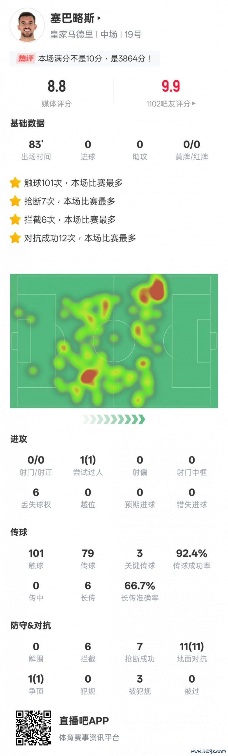 1月20日讯 西甲第20轮,皇马4-1拉斯帕尔马斯。本场比赛,塞巴略斯首发出战,送出3次关节传球,还有7次抢断和6次抑止均是全场最多,12次造反均奏效,评分8.8。
