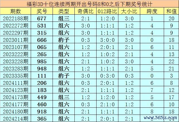 十位号码:前两期十位分歧出现奖号8-0,历史上福彩3D皆集前后分歧开出号码8-0的表象共开出88次。在十位8-0的表象出当前,最近15期其下期分歧开出号码:677-531-315-666-065-265-985-948-111-206-183-449-460-918-365;