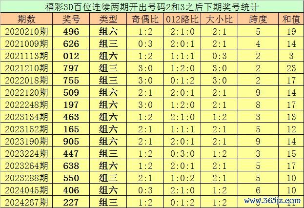 百位号码:皆集两期百位出号分歧为:2-3,历史上福彩3D皆集两期前后分歧出号2-3的奖号共出现93次。在百位2-3的奖号表象出当前,近15期下期分歧出号:496-626-012-797-755-509-197-463-165-905-447-638-550-406-227;