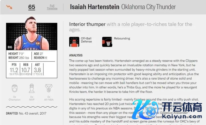 他全年完成247次掩护助攻(定约第12),为亚历山大和杰伦·威廉姆斯筑起弥留走廊。 就像豪杰的卢尼目田库里,哈滕的高质地挡拆让雷霆后卫群得到珍爱的错位空间。