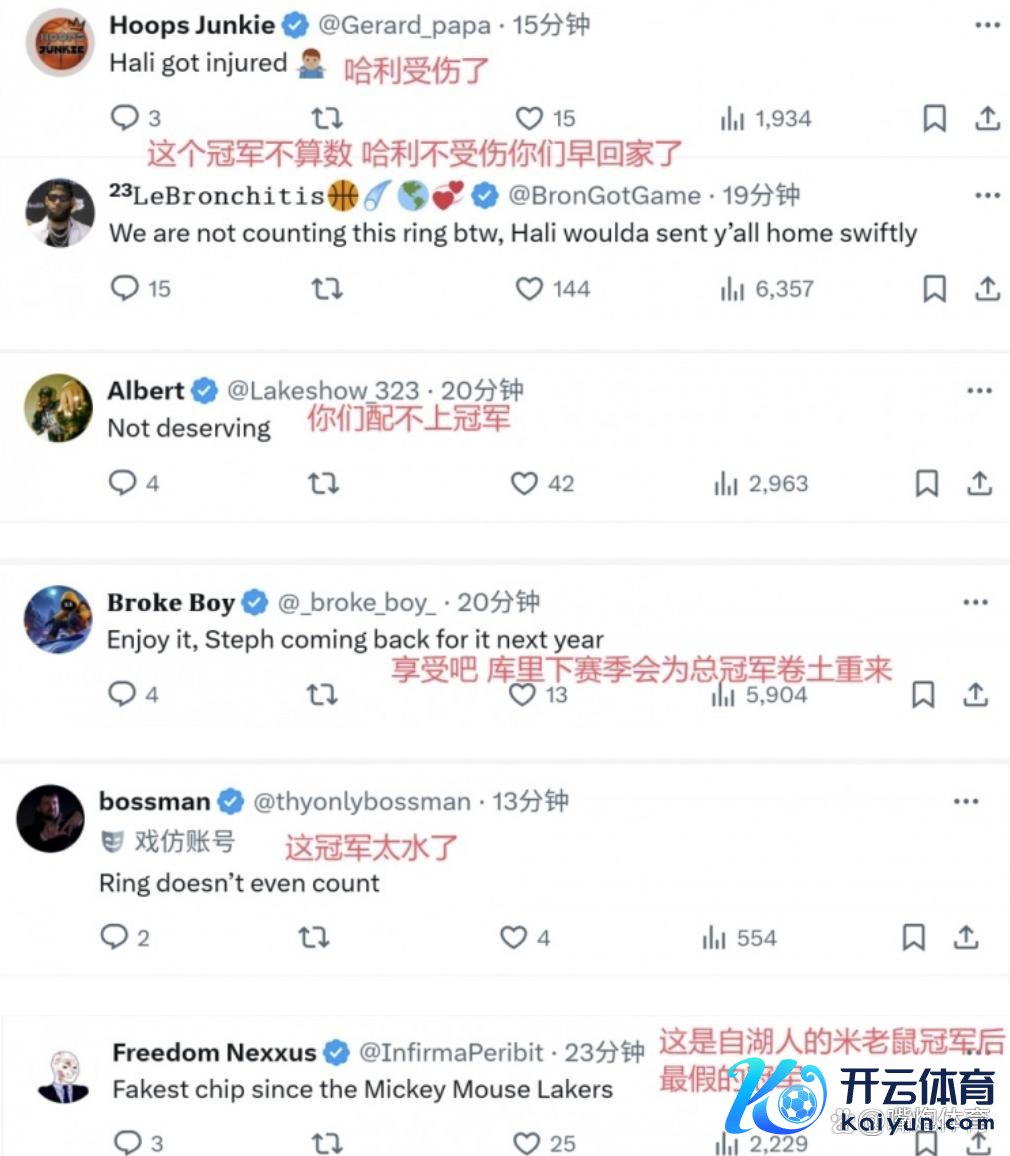 赛后不错看到好意思国网友带来了一个热议,他们在谈到此次总决赛的时候王人纷纷示意:“这个冠军饱和不算数,哈利伯顿要是不受伤,你们早就还是被淘汰回家了。”、“靠着哈利受伤,他们才调够拿到总冠军。”、“迅速趁着当前享受,下个赛季库里就会带队卷土重来夺冠了。”、“这饱和是一个最水的总冠军,此次的总冠军会是自从当初湖东说念主的米老鼠(园区冠军)之后最菜的阿谁。”