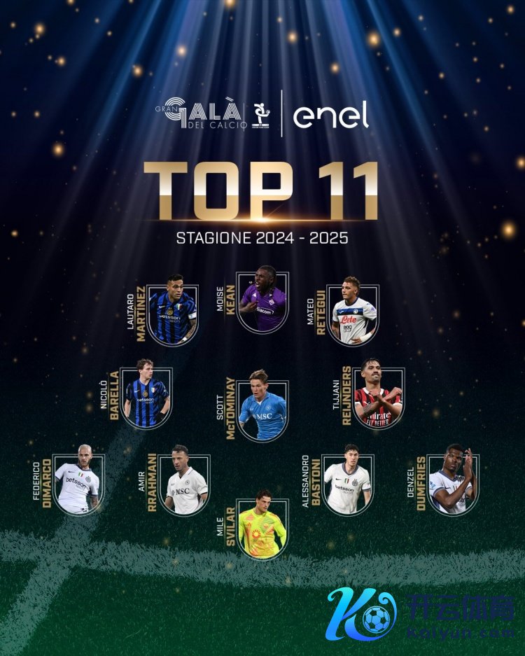 意大利球员协会上赛季意甲最好威望(上赛季遵守俱乐部)门将:斯维拉尔(罗马)后卫:迪马尔科(国米)、拉赫马尼(那不勒斯)、巴斯托尼(国米)、邓弗里斯(国米)中场:巴雷拉(国米)、麦克托米奈(那不勒斯)、赖因德斯(米兰)先锋:劳塔罗(国米)、基恩(佛罗伦萨)、雷特吉(亚特兰大) 体育赛事直播