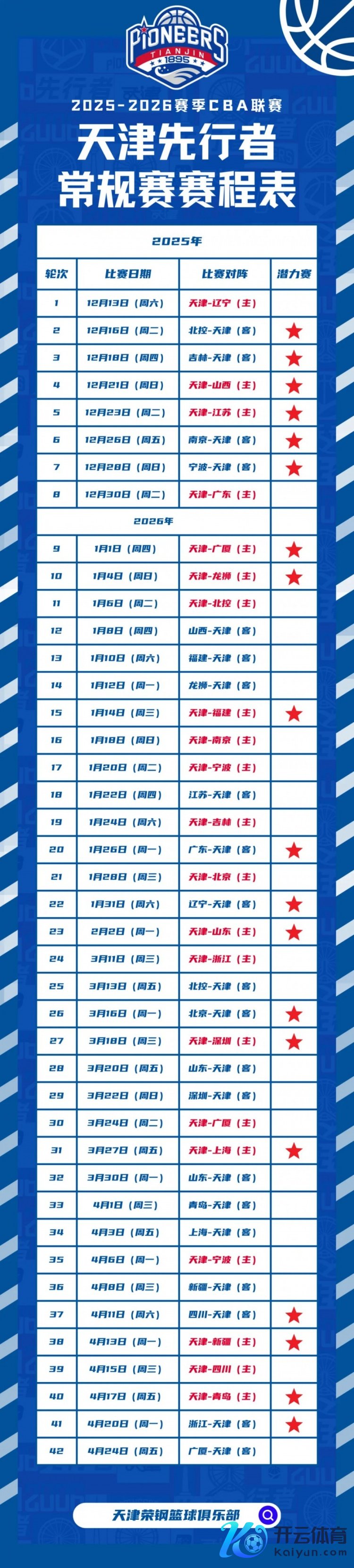 12月26日,2025-2026赛季CBA成例赛第6轮,天津先驱出征客场,挑战南京天之蓝,本场比赛被列为CBA后劲赛场次。天津5、抖音平台将直播本场比赛。
