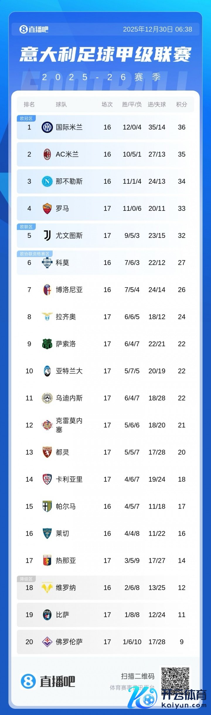 12月30日讯 意甲第17轮罗马3-1热那亚升第四。2025年意甲赛程一说念甘休,国米榜首收官,米兰第二,那不勒斯第三,尤文第五。最新积分榜如下: