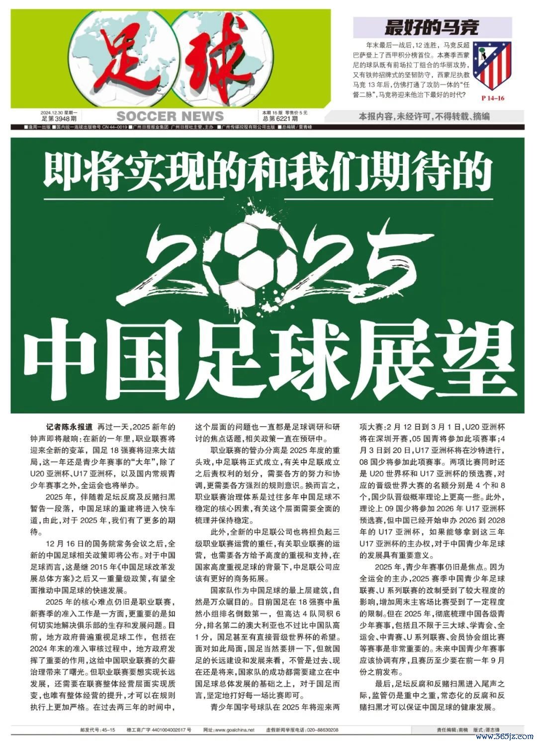 记者陈永报谈 再过一天,2025新年的钟声行将敲响:在新的一年里,劳动联赛将迎来全新的变革,国足18强赛将迎来大结局,这一年如故青少年赛事的“大年”,除了U20亚洲杯、U17亚洲杯,以及国内成例青少年赛事除外,全运会也将举办。伴跟着足坛反腐及反赌扫黑暂告一段落体育赛事直播,中国足球的重建将参加快车谈,由此,关于2025年,咱们有了更多的期待。