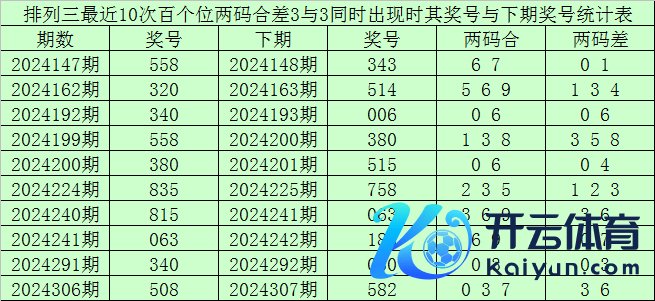 百个位合差分析:上期奖号百个位开出03组合,两码合为3,两码差为3,最近10次百个位两码合3与两码差3同期出当前,其奖号和下期奖号永别为: