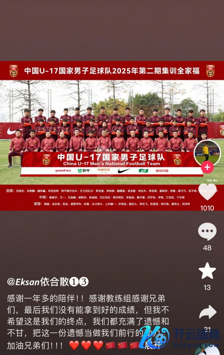 4月19日讯 近日,U17国足门将依合散更新社媒,晒出球队全家福、检会照、比赛照等,对本届U17亚洲杯之旅进行归来。