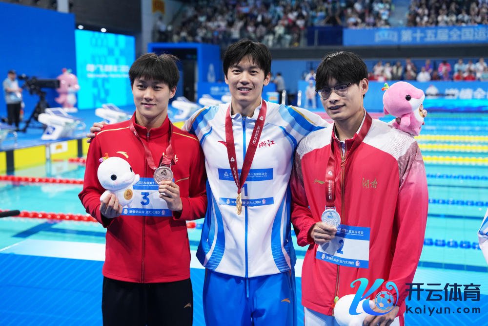 2025年11月17日,冠军汪顺(中)、亚军黄志伟(右)和季军何宇博在第十五届天下引导会游水男人400米个东说念主羼杂泳授奖典礼后合影。新华社记者 杜宇 摄