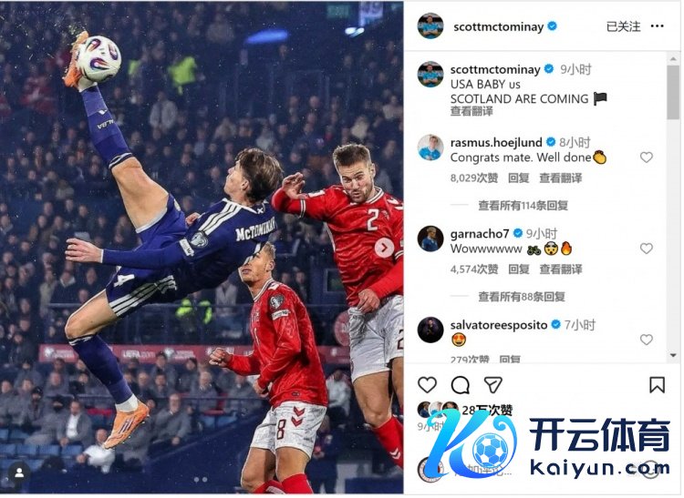 麦克托米奈社媒庆祝球队参加寰宇杯,配文:“好意思国宝贝,苏格兰来了!”