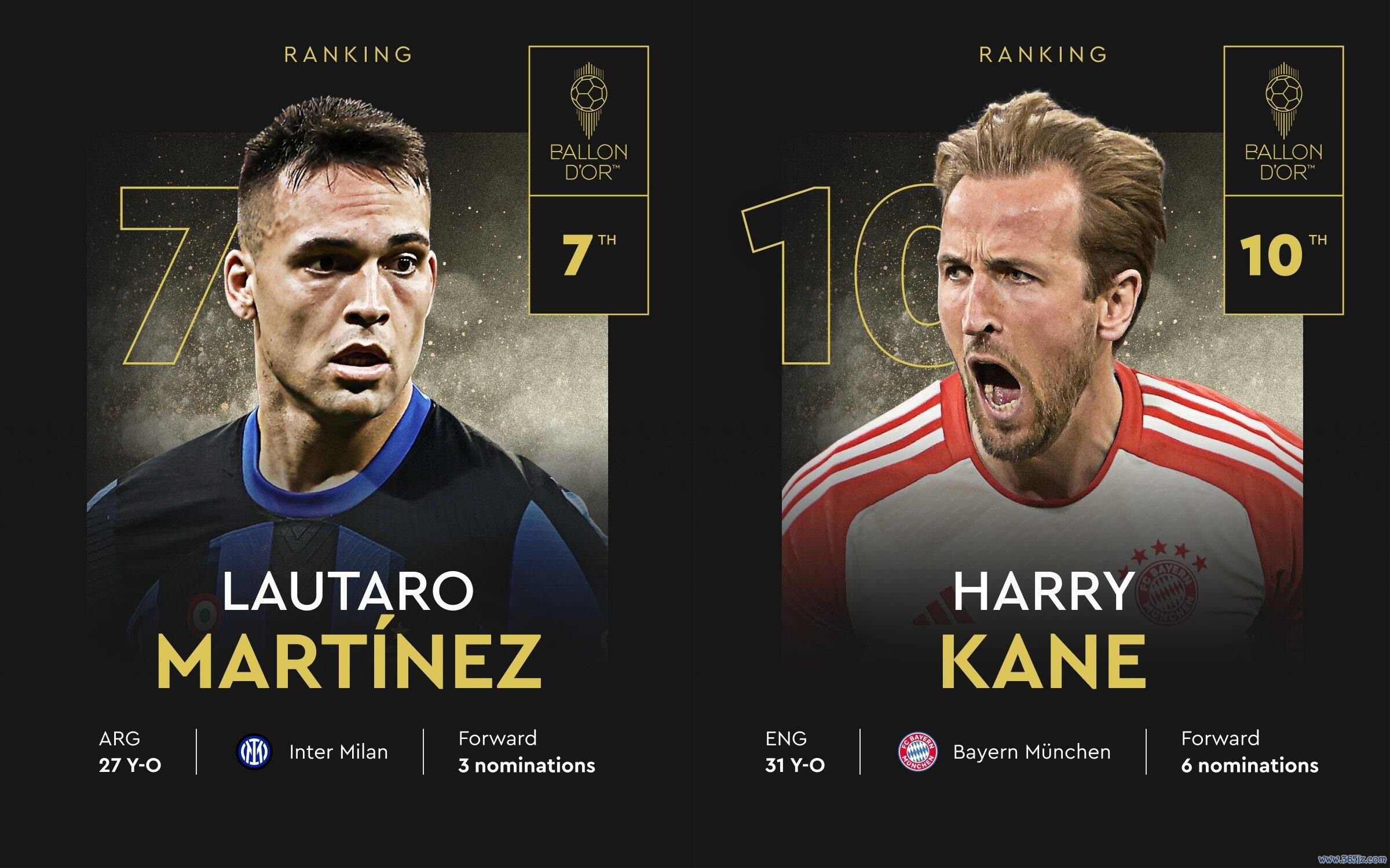2024金球名次前10的球员中,仅第7劳塔罗和第10凯恩未入选本年世足候选名单。