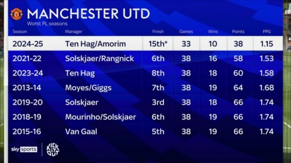 直播吧4月27日讯 今天21点,英超第34轮,曼联客战伯恩茅斯,天外体育列出曼联本赛季数据,球队积分确定会创造英超时期最差。 附曼联英超时期最差赛季: 2024-25赛季(尚未放手):滕哈赫/阿莫林 15位 33战10胜 积38分 场均1.15分 2021-22赛季:索尔斯克亚/朗尼克 6位38战16胜 积58分 场均1.53分 2023-24赛季:滕哈赫 8位 38战18胜 积60分 场均1.5......【更多...】
