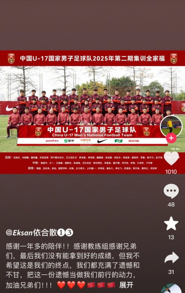 体育最新信息 4月19日讯 近日,U17国足门将依合散更新社媒,晒出球队全家福、检会照、比赛照等,对本届U17亚洲杯之旅进行归来。 依合散配文写说念:“感谢一年多的追随!!感谢锤真金不怕火组感谢昆季们,终末咱们莫得能拿到好的收获,但我不但愿这是咱们的特地,咱们王人充满了缺憾和不甘,把这一份缺憾算作念咱们前行的能源,加油昆季们!!!” 本届U17亚洲杯国足和沙特、乌兹别克斯坦和泰国同分在A组体育最新......【更多...】